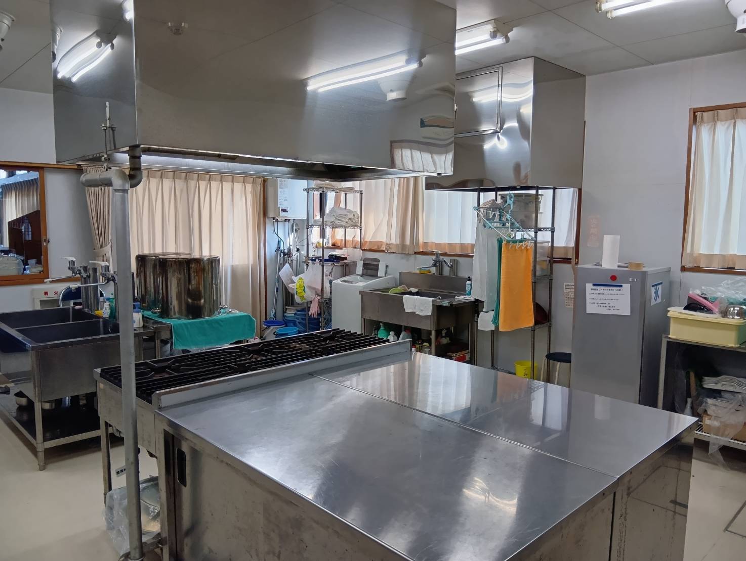 広々とした調理スペースです。大人数での炊事や合宿の食事作り、地元の食材を使った料理体験などにご利用いただけます。隣接する和室とつなげて食事会場として活用することもでき、天候に左右されず快適に自炊を楽しめます。