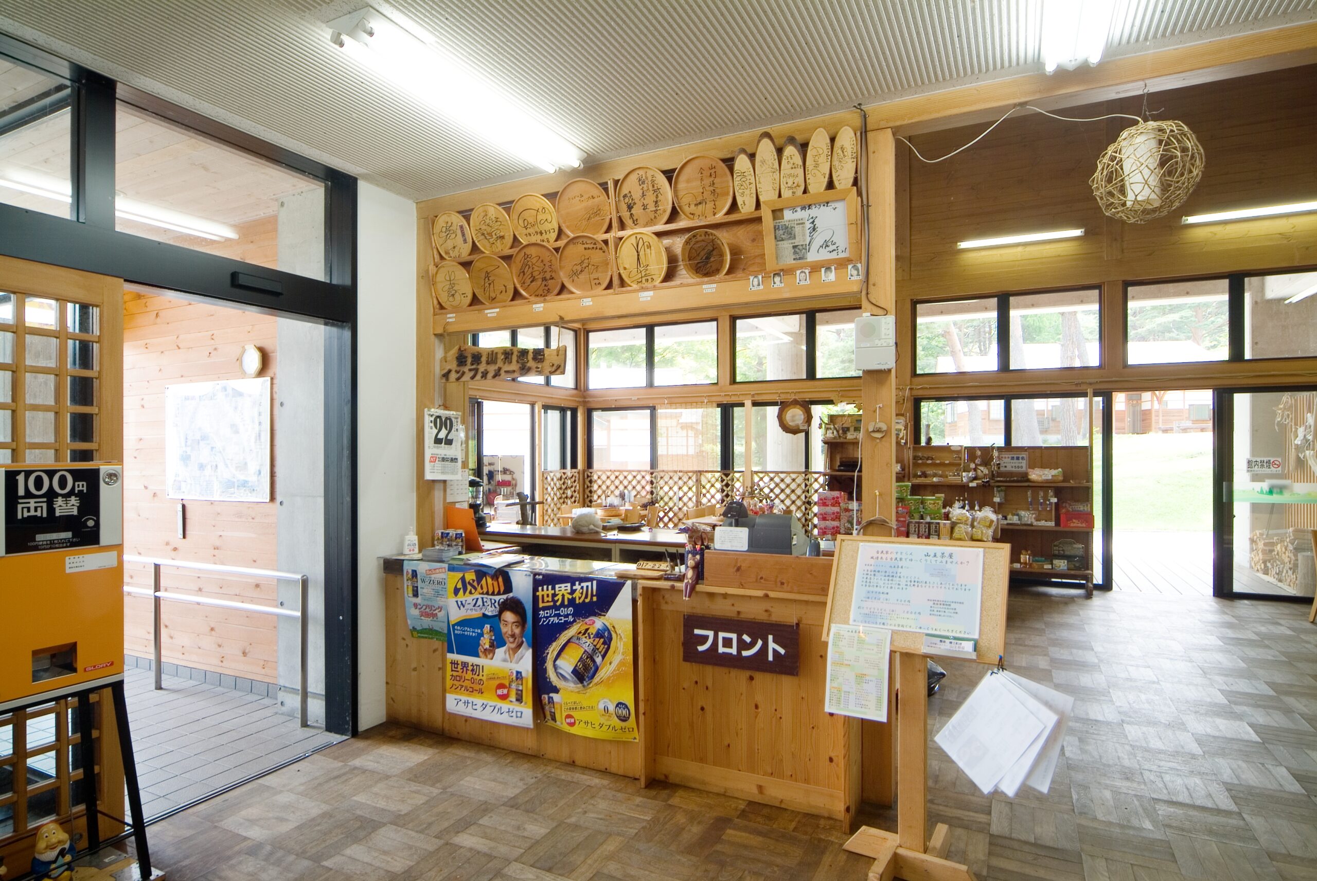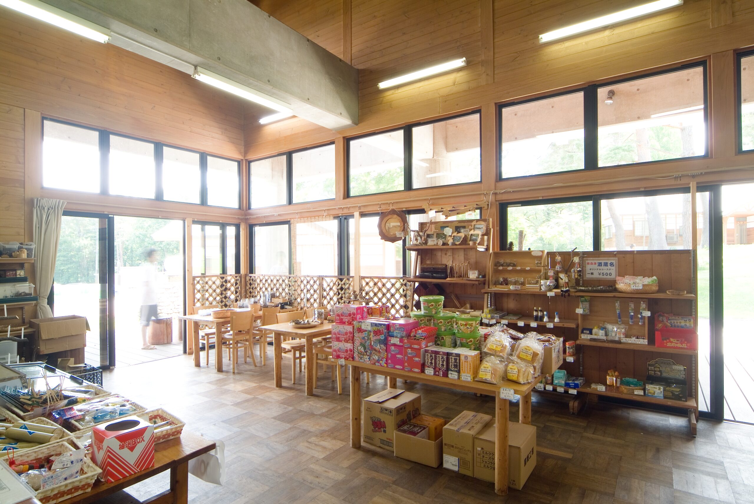 森の交流館は、会津sansonでの滞在をトータルにサポートする総合案内所です。キャンプや宿泊の受付をはじめ、地元の特産品やキャンプギアが揃う売店、雨天時でもアクティブに過ごせる体育館などを完備しています。